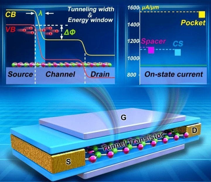 在隧道場效應(yīng)晶體管中,兩個小槽被一個能量勢壘分開。在第一個小槽中,一大群電子在靜靜等待著,晶體管沒有被激活,當施加電壓時,電子就會通過能量勢壘并且移入第二個小槽內(nèi),同時激活晶體管。TFET在結(jié)構(gòu)上類似于傳統(tǒng)晶體管,但在開關(guān)方面利用了量子力學隧道效應(yīng),既節(jié)能又快捷。