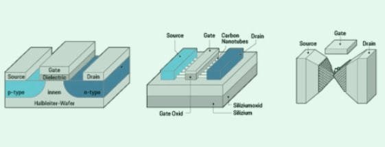 由于量子力學隧道效應(yīng),電子可以穿越絕緣體,這將使元件功能失效。人們開始尋找一種新型晶體管,可以進一步提高未來集成電路的性能,作為傳統(tǒng)晶體管的替代品。目前有很多研究,但還沒有領(lǐng)先者可以取代硅MOSFET。研究人員列出了一系列MOSFET替代品,包括隧道場效應(yīng)晶體管TFET,碳納米管場效應(yīng)晶體管,單原子晶體管。