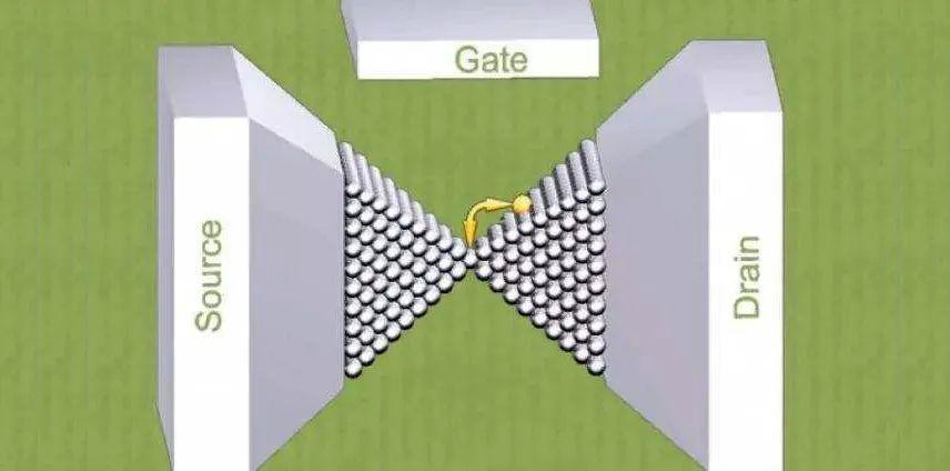 在單原子晶體管中,通過源極和柵極之間的電壓移動單個原子,從而關(guān)閉或打開源極和漏極之間的電路。